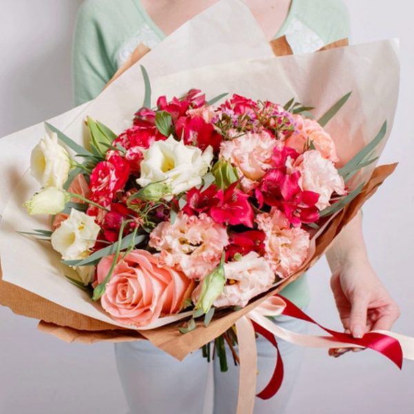 Pink roses, white lisianthus, peach carnations, red alstroemeria, red spray roses.