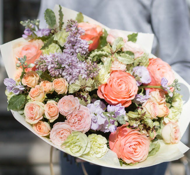 This bouquet of peach and pink roses, green carnation, lavender stocks and lilac is a charming gift for a birthday, anniversary, or anytime a special touch is required.