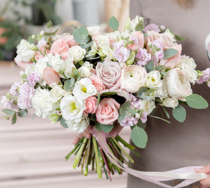 This bouquet is the epitome of romance! With soft pastel pinks, lilacs and white tones, it is comprised of roses, stocks, lisianthus, ranunculus, carnation and delicate eucalyptus. The perfect feminine touch for any occasion.