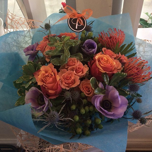This bouquet is a unique design with pincushion protea, anemone, eryngium, hypericum berries, regular and spray roses and green foliage.