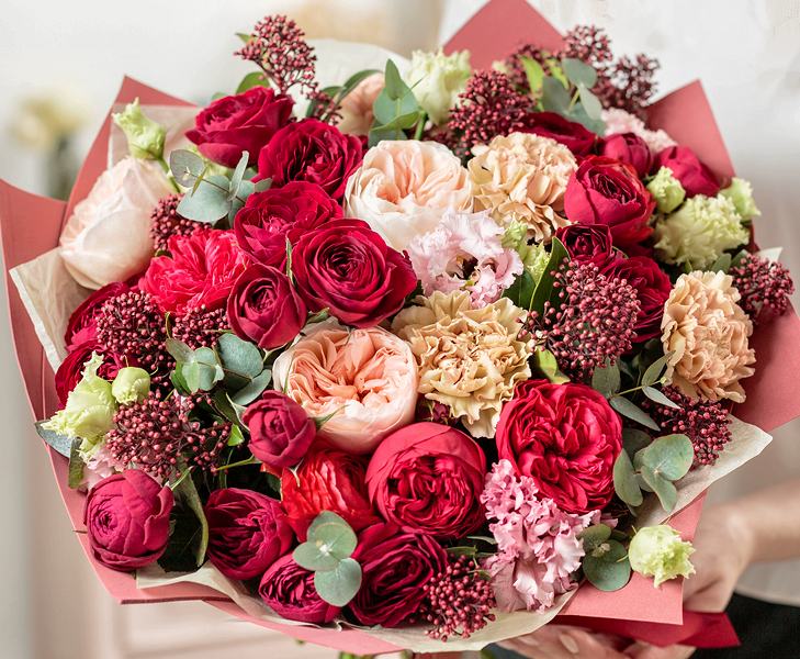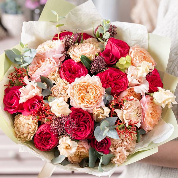 A romantic bouquet of garden and regular roses, lisianthus, carnations, skimmia, eucalyptus and filler flowers. A perfect gift for Mother’s Day.