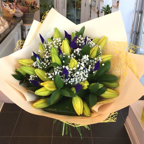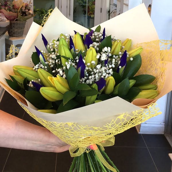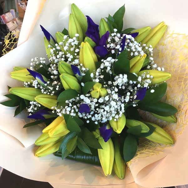 A bright summer combination of yellow hybrid lilies, blue iris, gypsophila, and some greenery. This is a wonderful bouquet for any occasion.