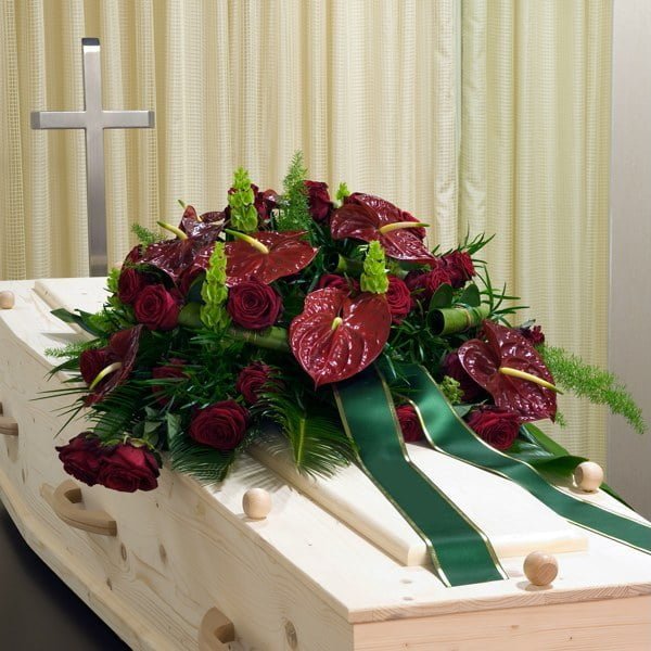 Burgundy anthurium and roses, green bells of Ireland, sago palm leaves, foxtail fern, and rolled tropical leaves create this lavish tropical casket spray.