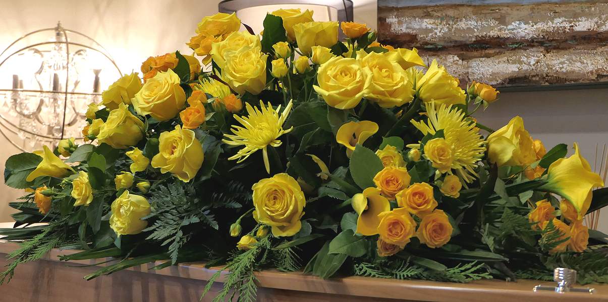 Bright golden yellow, this casket spray contains calla lilies, roses, spray roses, disbuds, and lots of fluffy green foliage to compliment.
