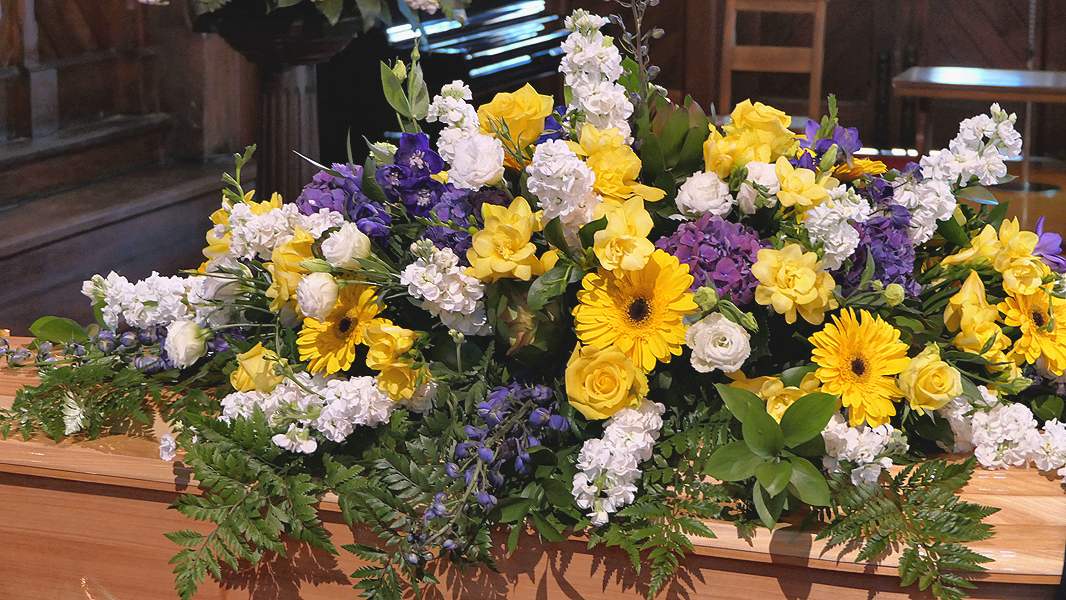 A beautiful composition of purple, white and yellow. This casket spray is designed with delphinium, hydrangea, stocks, lisianthus, freesia, roses, gerbera daisies, and soft ferns and ruscus.