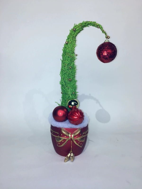 The ever popular grinch tree in traditional red and ceramic pot.
