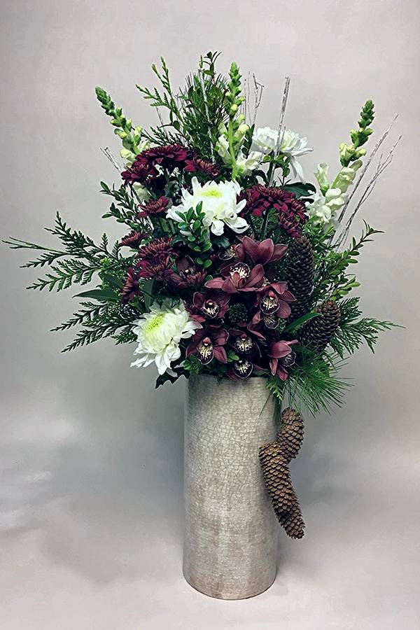 In a tall cream ceramic vase with fragrant evergreen, white snapdragons and disbuds, burgundy chrysanthemum and miniature cymbidium orchids, fir cones and branches.