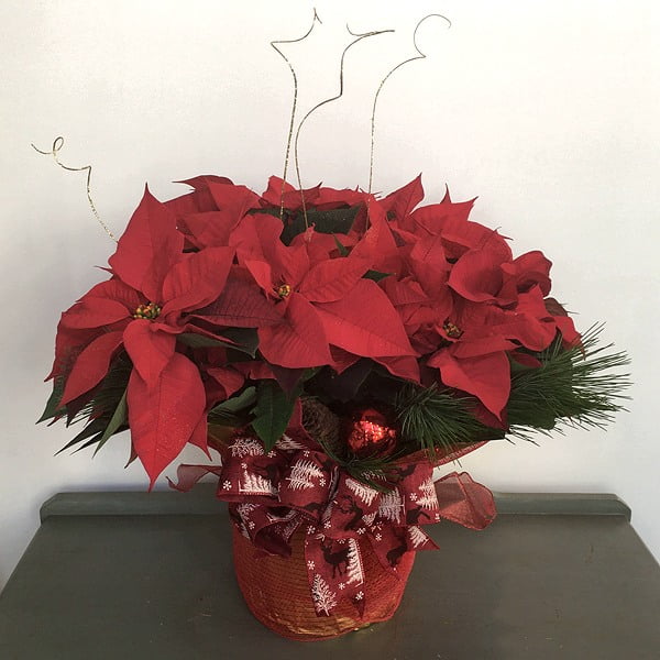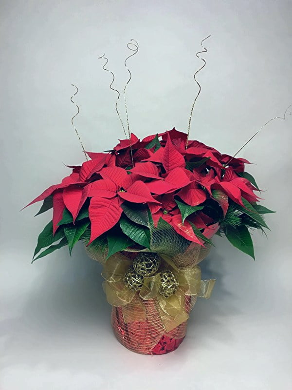 The deluxe version corresponds to size 10''-12'' pot multi-bloom poinsettia dressed in a fancy wrap with a Christmas bow, glitter, evergreen boughs.