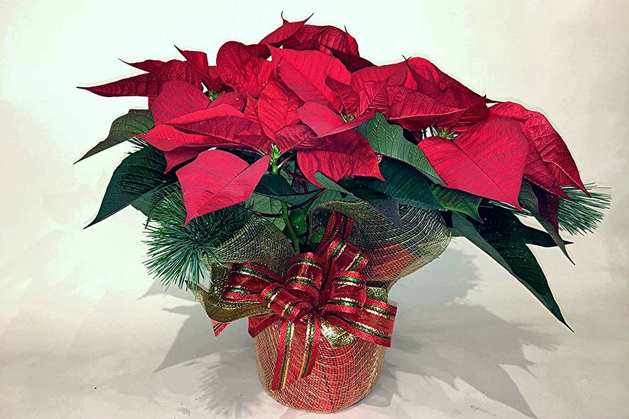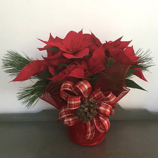 The standard version corresponds to size 4'' pot multi-bloom poinsettia dressed in a fancy wrap with a Christmas bow, glitter, evergreen boughs.