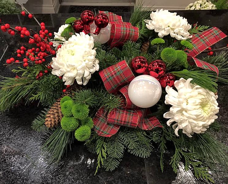 An oblong Christmas centerpiece in a plastic dish with fragrant evergreens, Kermit chrysanthemums, white disbuds, ilex berries, plaid ribbon,  fir cones and a combination of red and white ball ornaments.