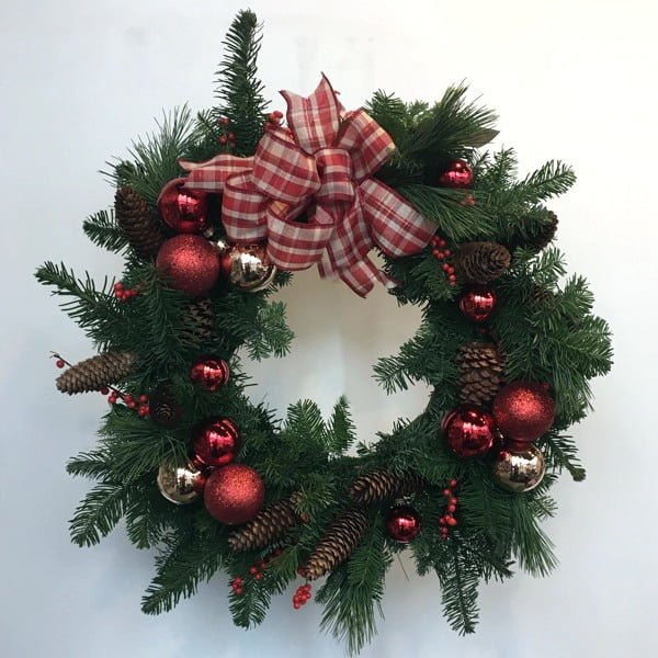 A fresh fragrant Christmas wreath with ilex berries, bright bobbles and pine and fir cones tied with a pretty plaid ribbon.