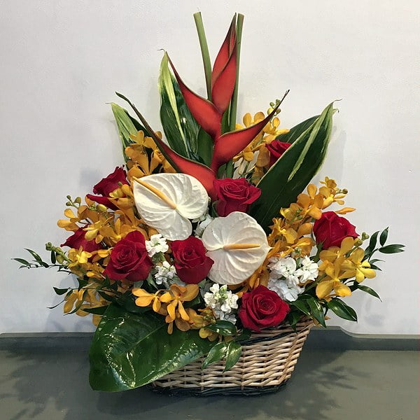 This stunning luxury tropical arrangement in a basket is the perfect statement piece for a corporate event. Heliconia, mokara orchids, red roses, white anthurium and stocks combine with tropical foliage to create this vibrant display.