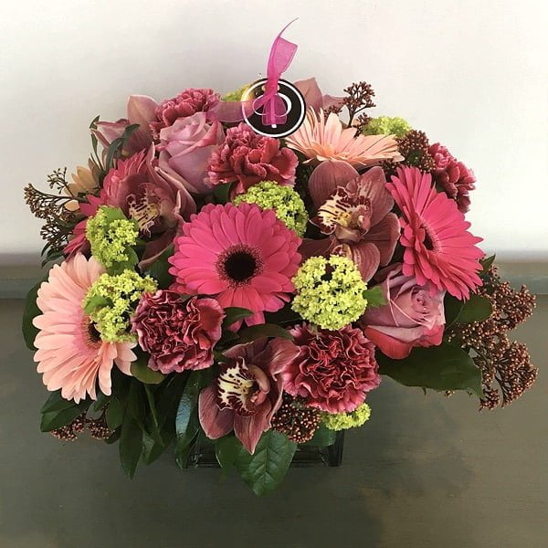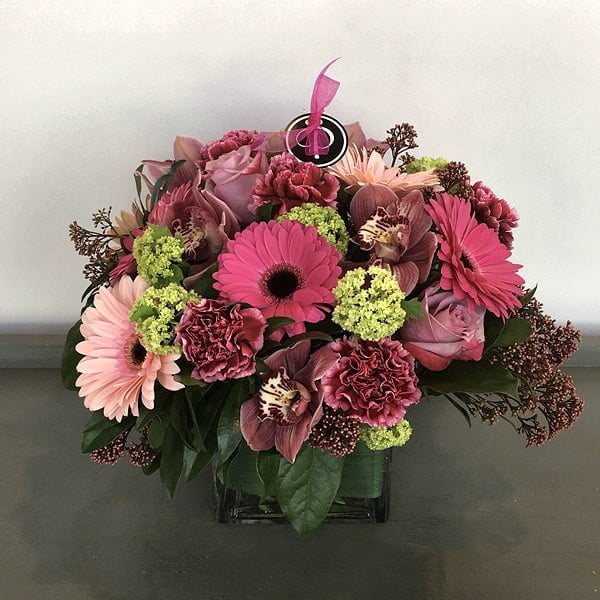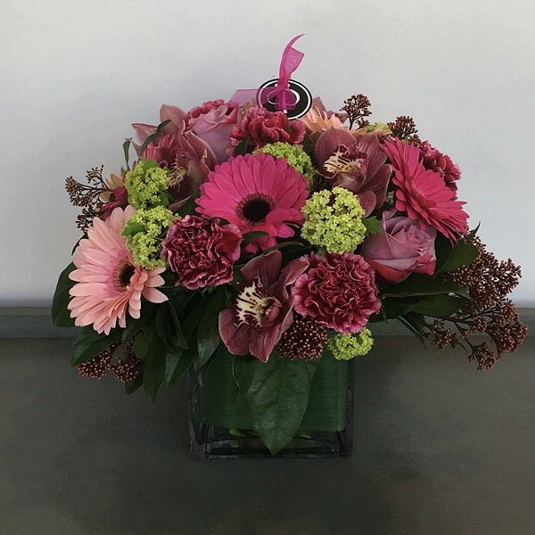 A beautiful centrepiece of burgundy carnations and cymbidium orchids, hot pink and light pink gerbera daisies, green viburnum, purple roses and skimmia in a 5” glass cube. A wonderful gift for Easter or any special day.