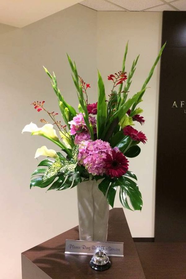 A stunning display in a tall ceramic vase with gladiola, calla lilies, hydrangea, crocosmia, gerbera daisies, cordyline, monstera and other tropical foliage.