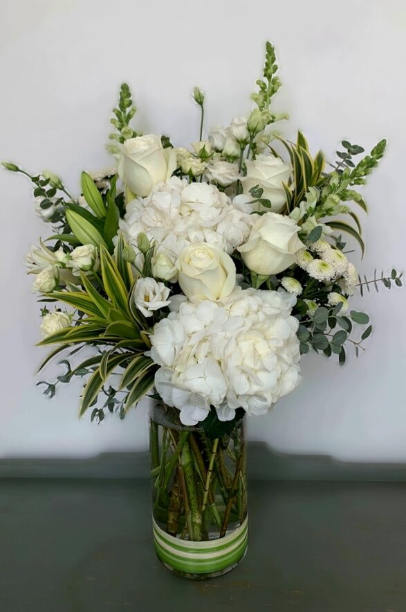 This all-white crafted arrangement features a luxury blend of premium florals, including lush hydrangeas, delicate roses, enchanting lisianthus and snapdragons with some tropical foliage in a tall glass cylinder.