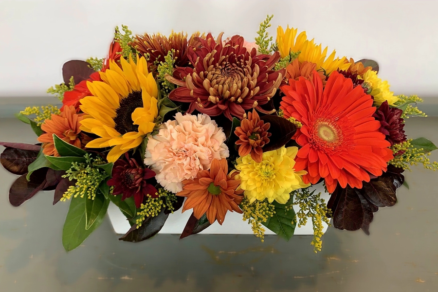 These gorgeous fall centerpiece ideas combine all colours shades for a bright, festive tablespace not only for your Thanksgiving dinner, but also for your birthday or anniversary party. The arrangement created in a 10’’ ceramic pot with pairs of sunflowers, gerberas, carnations, disbuds, spray chrysanthemums, and fall foliage.