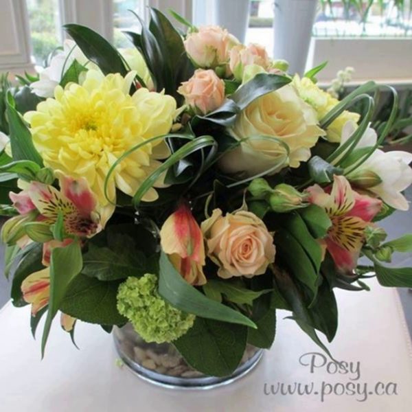 Soft creamy yellow and peach tones dominate this pretty centrepiece. Arranged in a clear glass cylinder vase with decorative rocks with yellow disbuds, green viburnum, yellow roses, peach spray roses, white freesia and two-tone coral alstroemeria. Loops of bear grass add interest. Perfect for Easter, or any occasion.