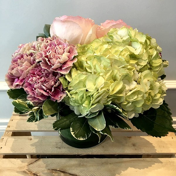 This elegant and unique arrangement is comprised of carnations, green hydrangea, big pink roses, pittosporum and a big beautiful succulent in a glass cylinder vase. A beautiful gift for any day.
