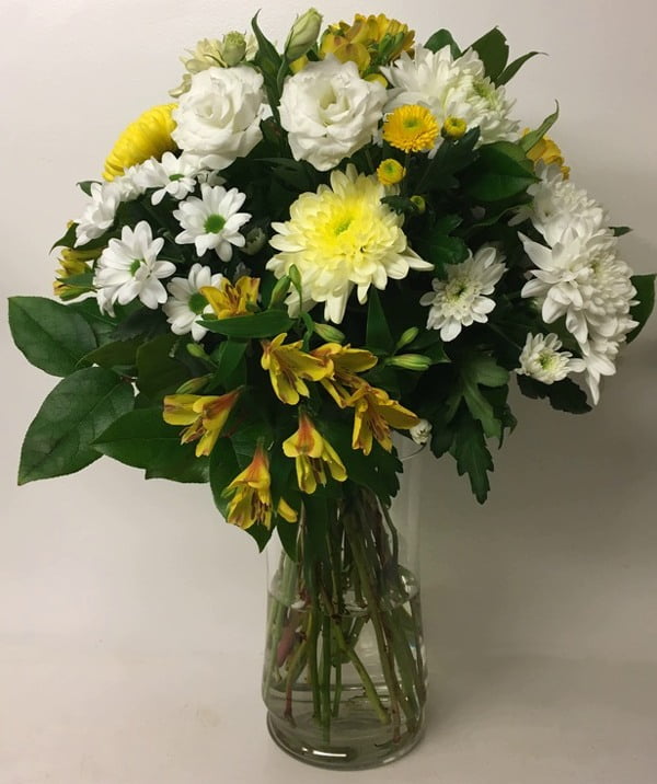Fresh and full, this crisp combination of yellow disbuds, alstroemeria, white mums, lisianthus and greenery in a vase will brighten anyone’s day!