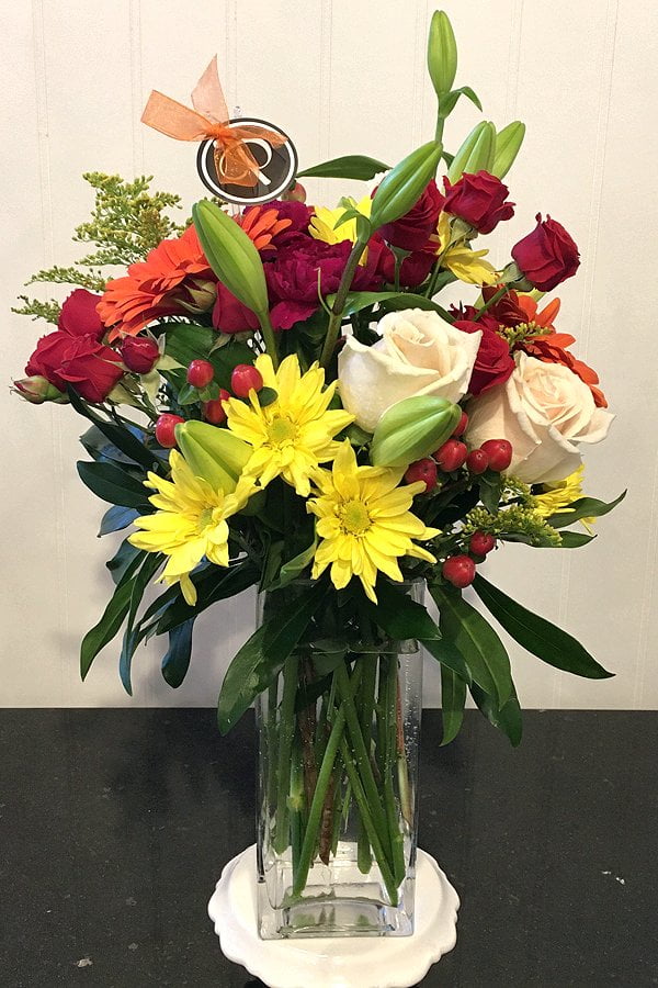 Cream roses and lilies are combined with red spray roses, hypericum, orange gerbera, yellow daisies and solidago in a rectangular vase. Pretty fall colours to add a touch of beauty to any room.