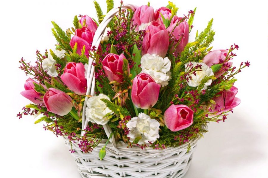 A feminine combination of pink tulips, white miniature carnations and heather in a pretty white basket. A wonderful gift for Valentine’s day.