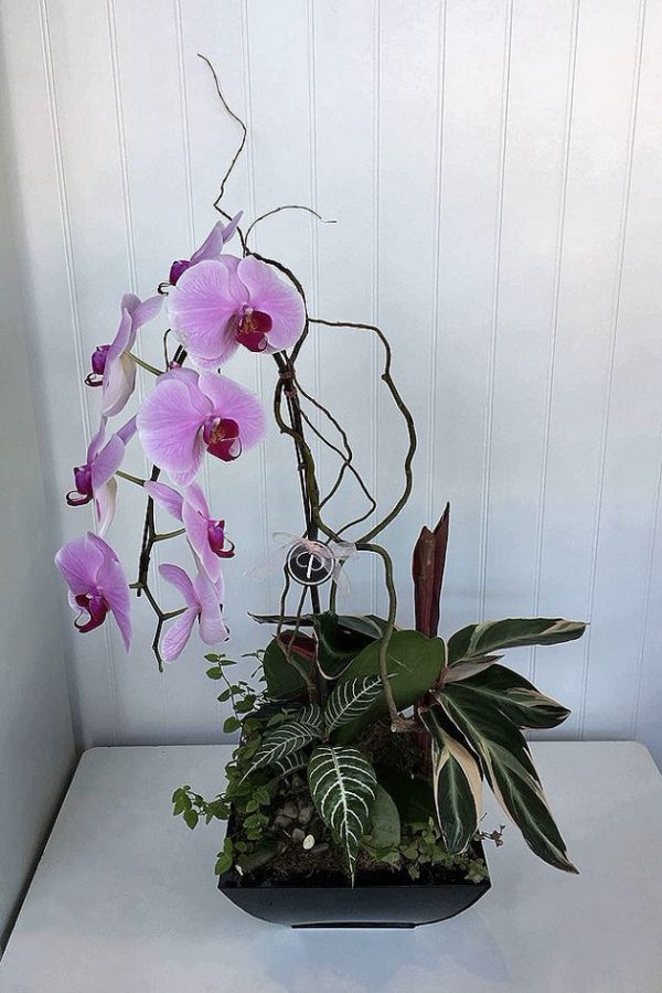 Mix tropical garden with an orchid plant in a square metal pot.