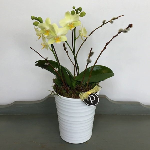A 4” miniature yellow Phalaenopsis orchid in a white ceramic pot with pussy willow.