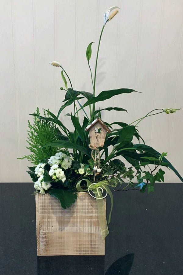 A wooden box filled with a cypress tree, peace lily, ivy, white kalanchoe and a ‘house’ decoration.