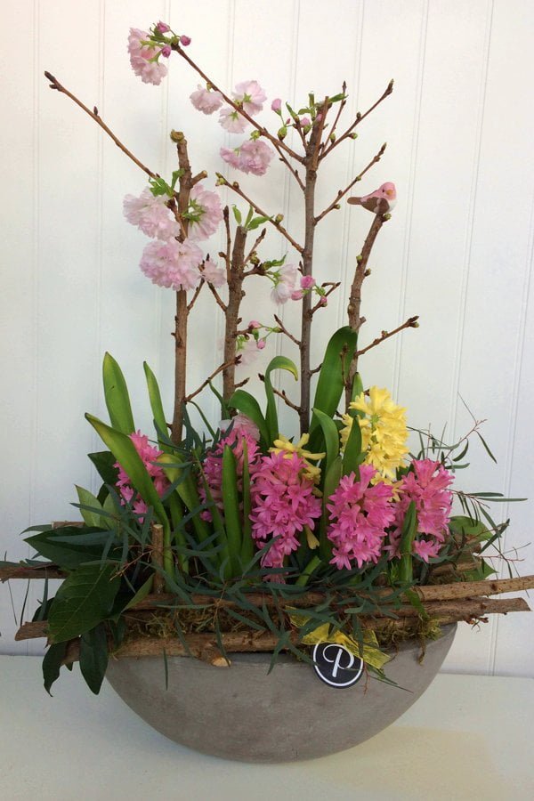 Bring the spring inside with this beautiful cement pot filled with assorted hyacinth plants and cherry blossom accents.