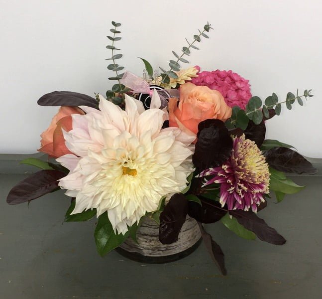 This pretty centrepiece of pink hydrangea, dahlia, disbud, rose, gerbera, smoke bush and eucalyptus adds a touch of beauty to any occasion!