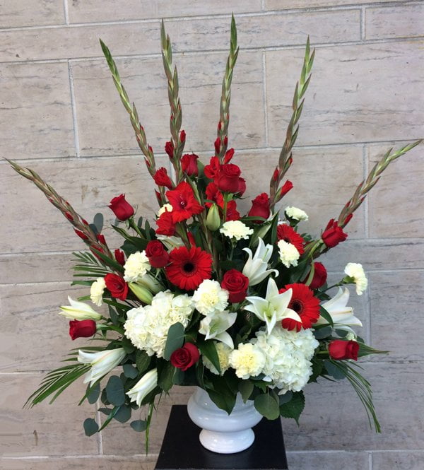 Dramatic and bold, this one-sided arrangement with red gladiola, gerbera daisies, and roses,002: white lilies, hydrangea and carnations, accented with palm leaves and eucalyptus is designed in a white urn container.