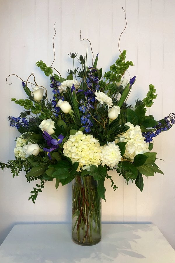 Large and one-sided, this display is perfect for a church, funeral home or corporate event. Blue delphinium, eryngium and iris, alongside bells of Ireland, white roses, mums, hydrangea, and disbuds create a stunning display in a glass vase with curly willow that reaches for the stars!