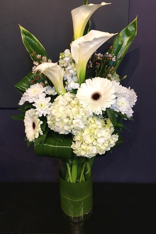 This modern classic style with calla lilies, hydrangea, gerbera daisies, stocks and chrysanthemums, accented by tropical leaves and waxflower is a best seller.
