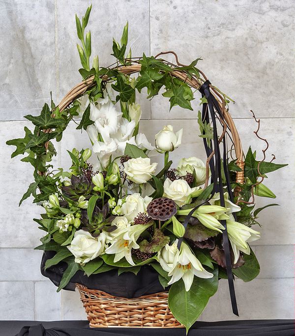 This rustic wicker basket is overflowing with velvety red roses and red germini with green ivy creeping over the handle and black ribbons to accent this gorgeous tribute.