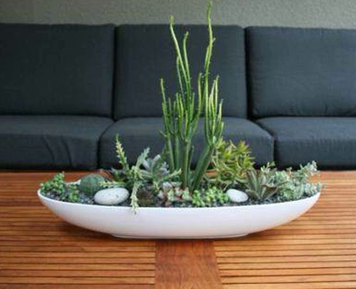 The succulent garden from 7-8 different plants in a white oval ceramic pot. The option can vary depending on stock. The pot can be changed.