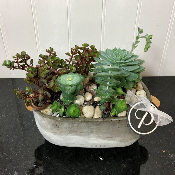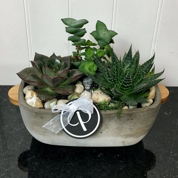 A rustic combination of hardy succulents in a cement container with river rock embellishment. The pot may be changed.