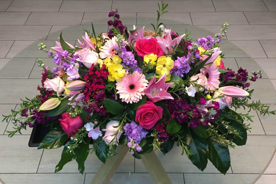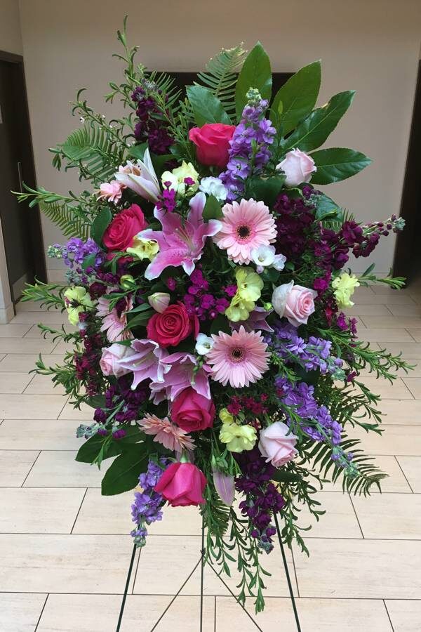 This gorgeous garden style spray includes hot and light pink roses, stocks, pink lilies and gerbera daisies, sweet William,  white freesia, ranunculus and assorted lush foliage. Includes easel and wet floral cage.