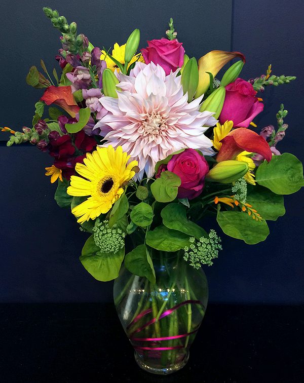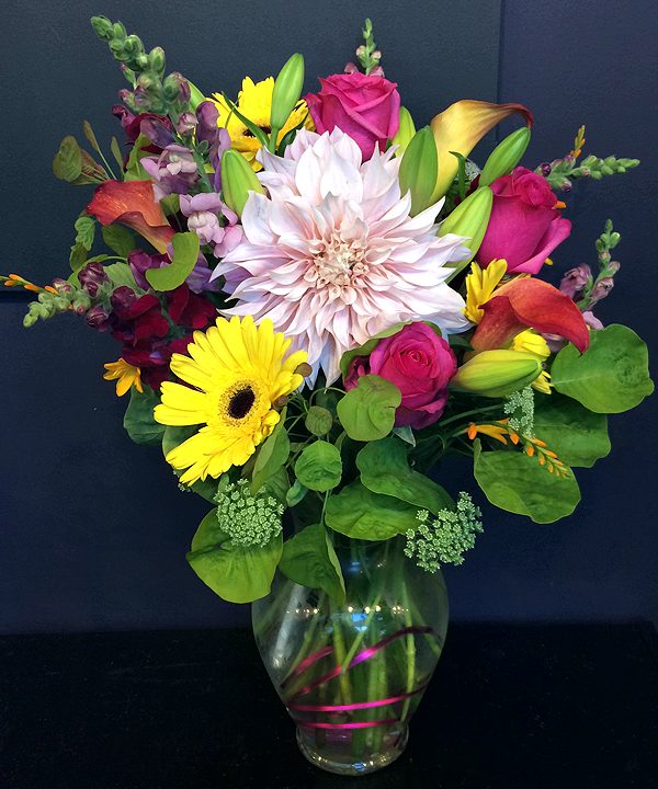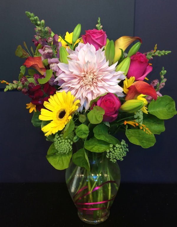 This gorgeous vase arrangement comes with a colourful swirl of wire in the glass vase. Designed with calla lilies, gerbera daisies, snapdragons, roses, queen Anne’s lace, lilies, dahlia, crocosmia and lime green smoke tree.