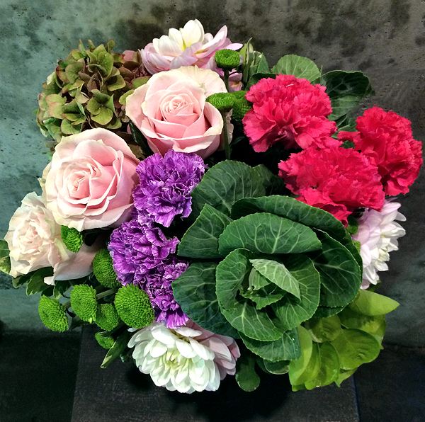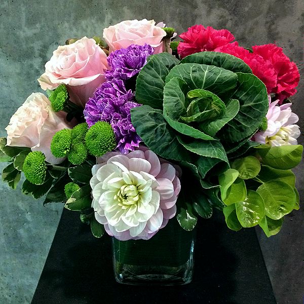 A compact centerpiece in a glass cube, composed of ornamental kale, roses, carnations, button mums, dahlia, hydrangea and a variety of green foliage.