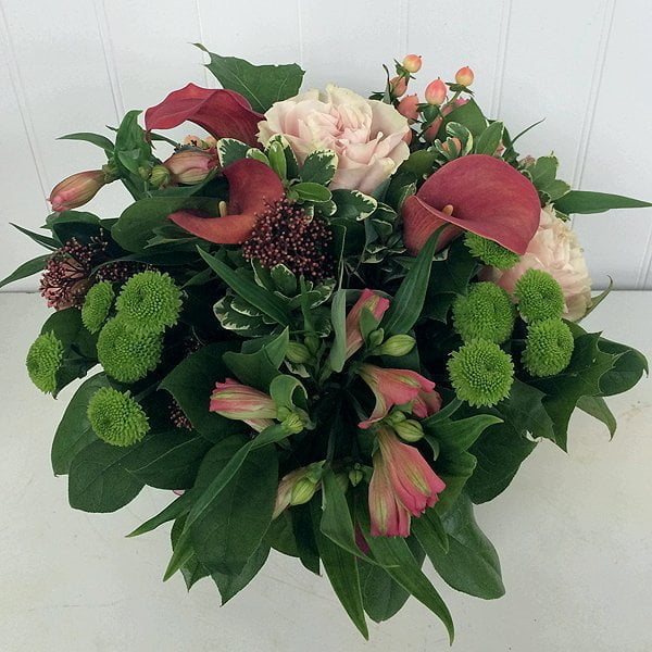 A soft and elegant centerpiece in a glass cylinder vase with calla lilies, hypericum berries, roses, alstroemeria, button mums, and assorted foliages.