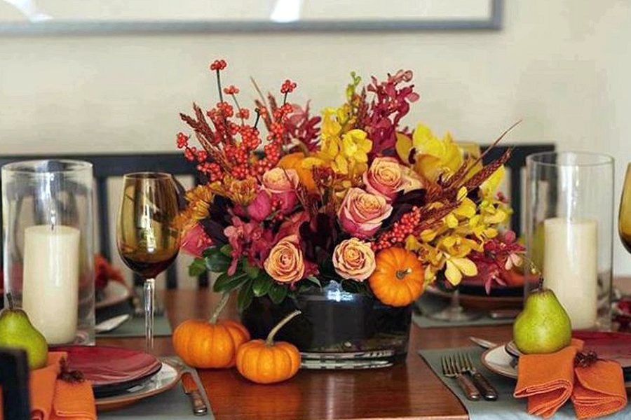 Celebrate Thanksgiving in style with this elegant centerpiece. In a glass cylinder vase it has roses, mokara orchids, berries, chrysanthemums and assorted foliage with miniature pumpkin and wheat accents.