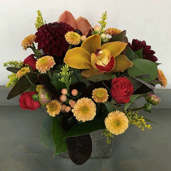 A 4” silver cube with solidago, smoke tree, hypericum berries,  cymbidium orchids, dahlia, spray roses, and chrysanthemums.