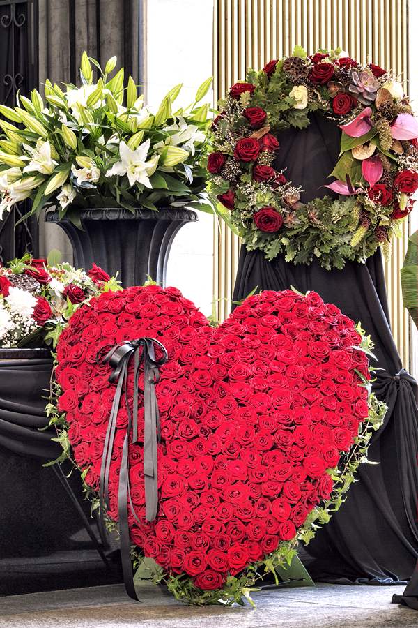 The epitome of luxury, a grand statement of 400 velvety roses in a heart shape with an edging of ivy and a black bow accent. Includes easel.