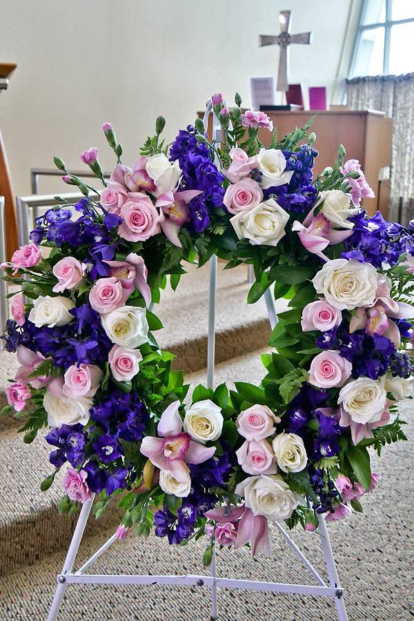 This bright and feminine wreath consists of pink miniature carnations, roses and cymbidium orchids, purple delphinium, white roses, ruscus and leather fern. Includes easel.