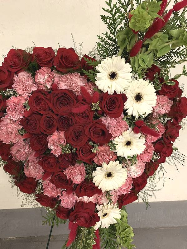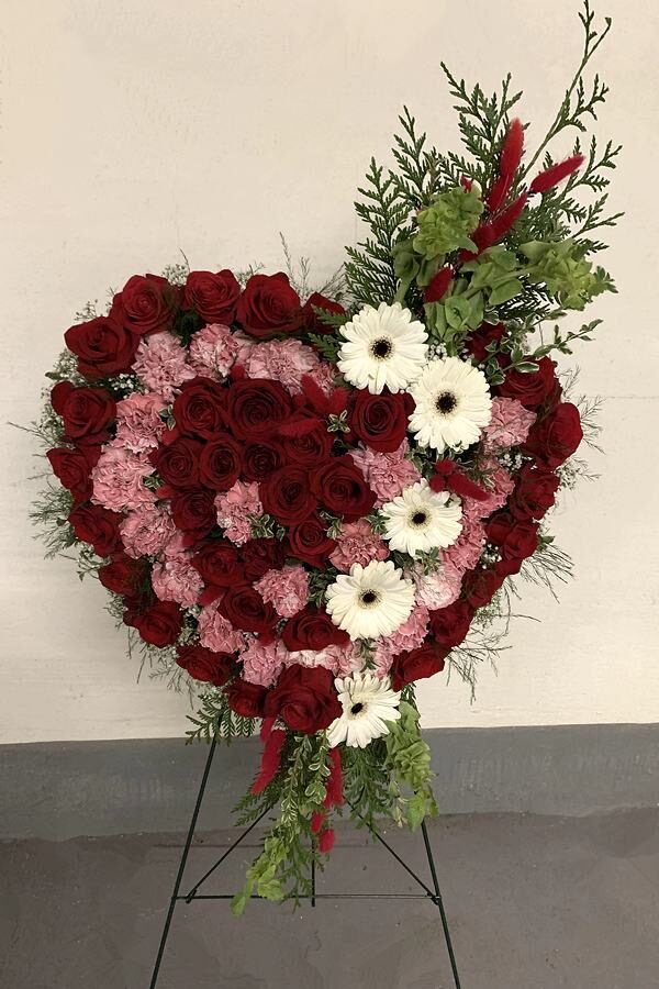 A lavish symbol of your love. This wreath is full of a swirling design of red roses, pink carnations and white gerberas and a spray of greenery, bells of Ireland and red bunny tails to complete the look. Easel included.